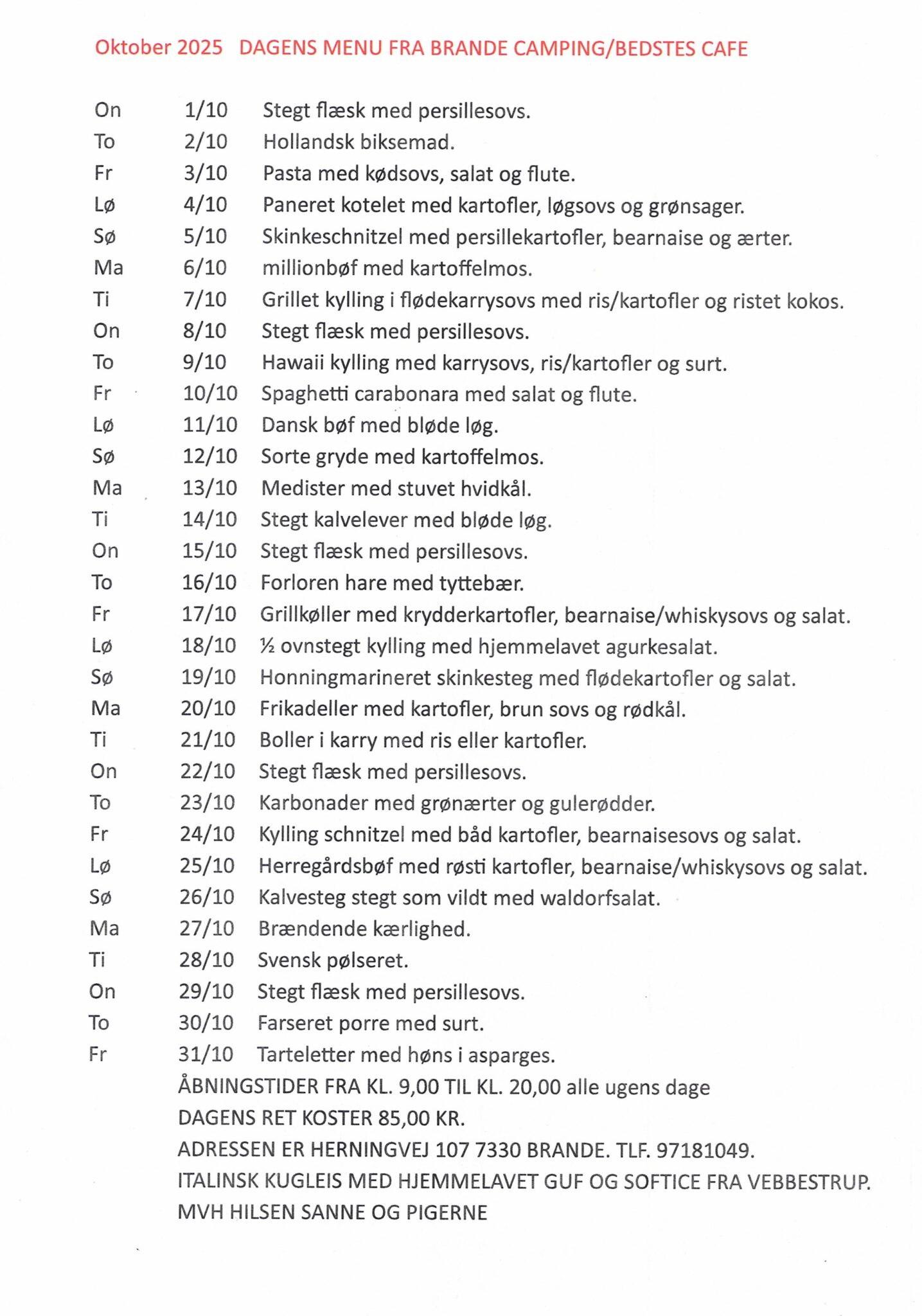 Månedens menu: Hver måned præsenterer vi en velsmagende månedens menu, som du kan finde på vores Facebook-side. Månedens menu er simpelthen fyldt med lækre danske klassikere – ren og skær dansk hygge på tallerkenen.